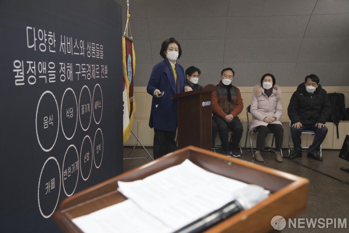 [서울=뉴스핌] 국회사진취재단 = 박영선 서울시장 예비후보가 2일 오전 서울 신월동 신영시장 상인회에서 서울시 대전환-디지털경제로의 대전환의 일환으로 소상공인 구독경제 정책발표를 하고 있다. 이용선의원, 신영시장 상인회장, 양천구청장, 구로구청장이 배석했다. 2021.02.02 photo@newspim.com