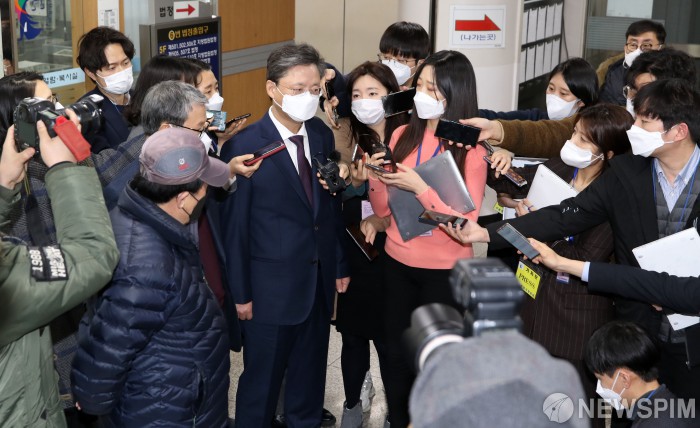 [서울=뉴스핌] 백인혁 기자 = 박근혜 정부 당시 국정농단을 묵인하고 국가정보원을 통해 불법사찰 한 혐의로 재판에 넘겨진 우병우 전 청와대 민정수석이 4일 오후 서울 서초구 서울고등법원에서 열린 항소심 선고 공판을 마치고 법원을 나서며 취재진에게 입장을 밝히고 있다. 이날 법원은 우 전 수석에게 징역 1년을 선고했다. 2021.02.04 dlsgur9757@newspim.com
