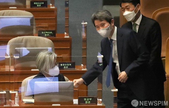 [서울=뉴스핌] 이형석 기자 = 이인영 통일부 장관(가운데)이 4일 국회 본회의장에서 강경화 외교부 장관과 인사하고 있다. 21.02.04 leehs@newspim.com