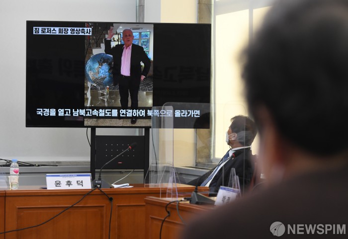 [서울=뉴스핌] 이형석 기자 = 이낙연 더불어민주당 대표 등 참석자들이 4일 오후 서울 여의도 국회에서 열린 남북고속철도 추진 특위 발대식에서 짐 로저스 회장 영상축사를 보고 있다. 2021.02.04 leehs@newspim.com