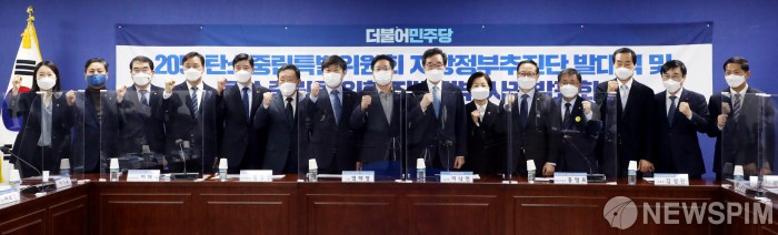 [서울=뉴스핌] 최상수 기자 = 5일 오전 서울 여의도 국회 의원회관에서 열린 더불어민주당 2050탄소중립특별위원회 지방정부추진단 발대식 및 탄소중립을 위한 지방정부 사례발표회에서 이낙연 대표를 비롯한 참석자들이 기념촬영을 하고 있다. 2021.02.05 kilroy023@newspim.com