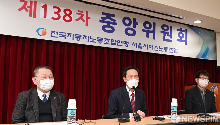 [서울=뉴스핌] 국회사진취재단 = 우상호 더불어민주당 서울시장 예비후보가 5일 서울 용산구 서울버스노조 회의실에서 열린 간담회에서 인사말을 하고 있다. 왼쪽부터 박점곤 서울버스노동조합 위원장, 우 예비후보, 우영찬 서울시의회 교통위원장. 2021.02.05 photo@newspim.com