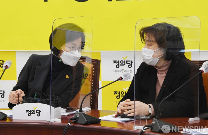 [서울=뉴스핌] 이형석 기자 = 강은미 정의당 비상대책위원장(왼쪽)과 배복주 젠더인권본부장이 8일 오전 국회에서 열린 비상대책위원회 회의에서 대화를 나누고 있다. 2021.02.08 leehs@newspim.com