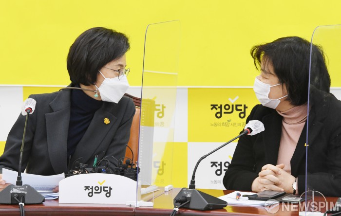[서울=뉴스핌] 이형석 기자 = 강은미 정의당 비상대책위원장(왼쪽)과 배복주 젠더인권본부장이 8일 오전 국회에서 열린 비상대책위원회 회의에서 대화를 나누고 있다. 2021.02.08 leehs@newspim.com