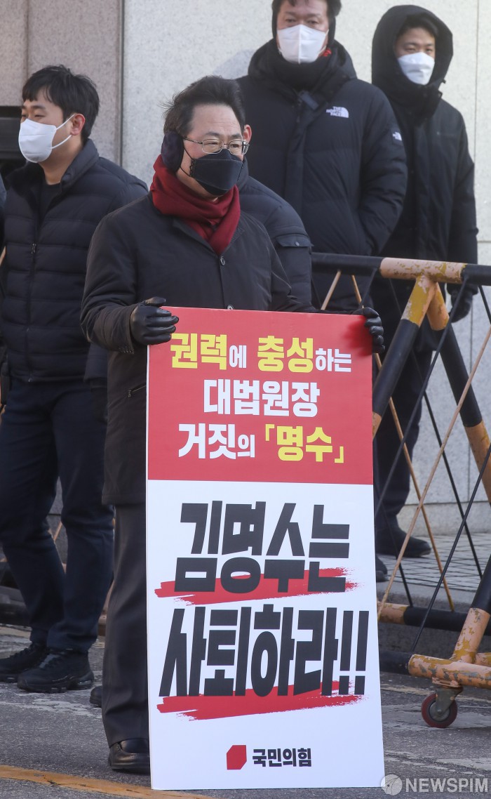 [서울=뉴스핌] 최상수 기자 = 주호영 국민의힘 원내대표가 8일 오전 서울 서초구 대법원 앞에서 김명수 대법원장의 사퇴를 촉구하는 1인 시위를 하고 있다. 2021.02.08 kilroy023@newspim.com