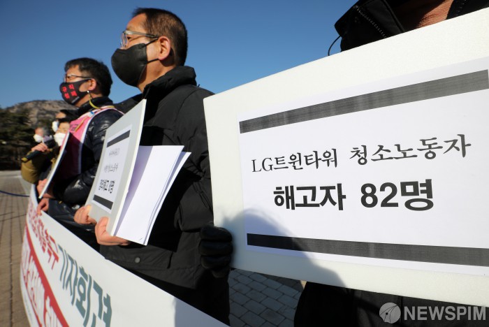 [서울=뉴스핌] 백인혁 기자 = 공공운수노조가 8일 오전 서울 종로구 청와대 분수대 앞에서 공공운수노조 장기 투쟁 사업장 해결 촉구 기자회견을 열고 1000명의 해고자 문제를 청와대가 설전에 해결할 것을 촉구하고 있다. 2021.02.08 dlsgur9757@newspim.com