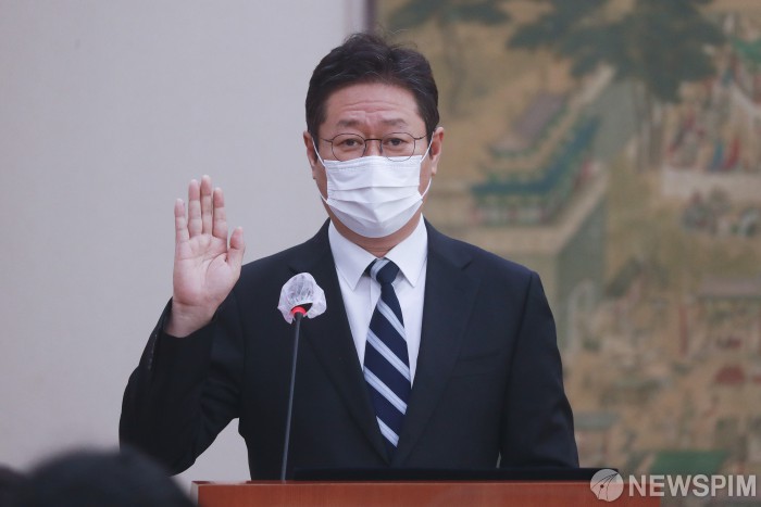 [서울=뉴스핌] 이형석 기자 = 황희 문화체육관광부 장관 후보자가 9일 오전 서울 여의도 국회에서 열린 인사청문회에서 선서를 하고 있다. 2021.02.09 leehs@newspim.com