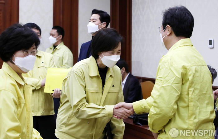 [서울=뉴스핌] 윤창빈 기자 = 황희 신임 문화체육관광부 장관이 14일 오후 서울 종로구 정부서울청사에서 열린 코로나19 대응 중대본회의에 참석해 유은혜 사회부총리와 인사를 나누고 있다. 2021.02.14 pangbin@newspim.com