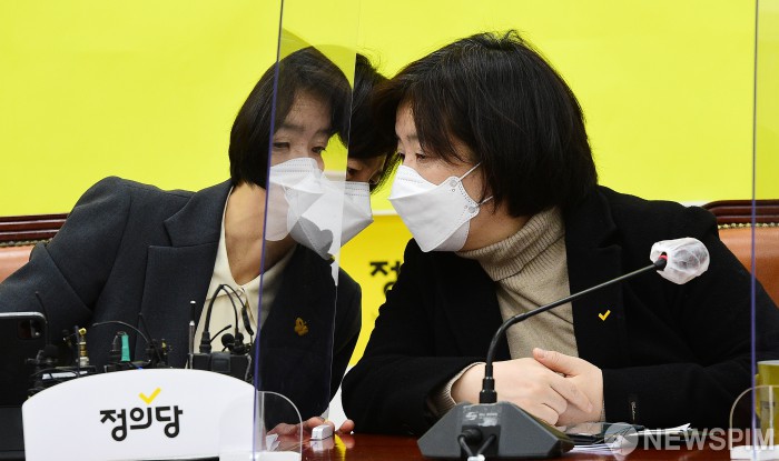 [서울=뉴스핌] 최상수 기자 = 강은미 정의당 비상대책위원장과 배복주 젠더인권본부장이 15일 국회에서 열린 비상대책위원회 회의에서 대화를 나누고 있다. 2021.02.15 kilroy023@newspim.com