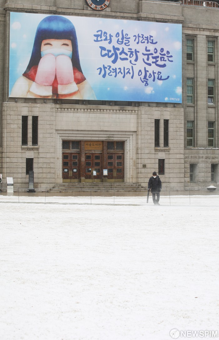 [서울=뉴스핌] 최상수 기자 = 서울에 한파주의보가 발령된 16일 오전 서울 중구 서울시청 앞 광장에서 시 관계자들이 쌓인 눈을 치우고 있다. 2021.02.16 kilroy023@newspim.com