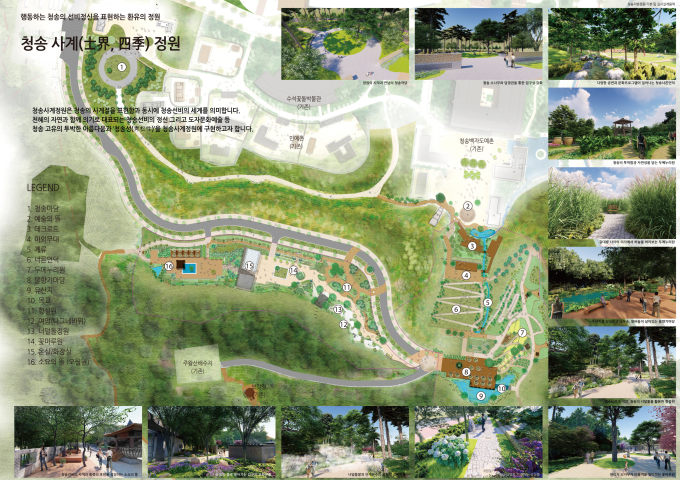 '향설원'은 청송의 너덜돌 등 자연소재와 다양한 수목, '꽃마루원'은 청송의 선비정신, '오월원'은 선비의 사색과 풍류를 상징하는 테마로 꾸며진다.