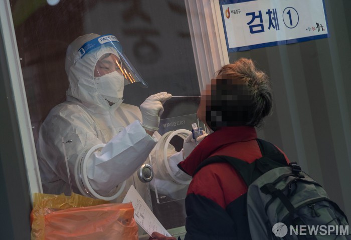 [서울=뉴스핌] 윤창빈 기자 = 17일 오전 서울 중구 코로나19 임시선별검사소에서 시민들이 검사를 받고 있다. 오늘(17일) 0시 기준 국내 신종 코로나바이러스 감염증(코로나19) 신규 확진자 수는 621명으로, 38일만에 600명 대로 올라섰다. 2021.02.17 pangbin@newspim.com
