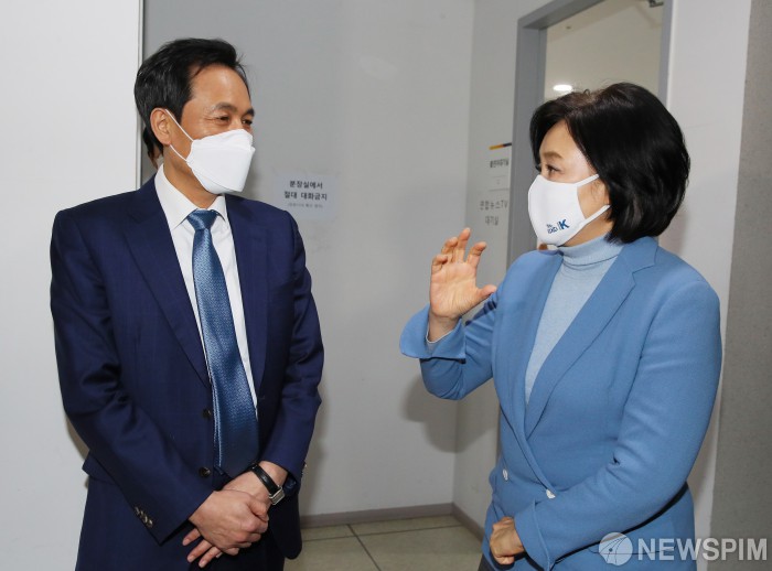 [서울=뉴스핌] 국회사진취재단 = 더불어민주당 박영선(오른쪽), 우상호 서울시장 경선후보가 17일 서울 종로구 연합뉴스TV에서 더불어민주당 서울시장 경선후보 TV토론을 하기 전 분장실 앞에서 대화하고 있다. 2021.02.17 photo@newspim.com