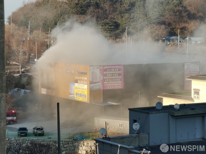 [동해=뉴스핌] 이형섭 기자 = 17일 오후 4시50분쯤 강원 동해시 천곡동 A모델하우스에서 화재가 발생했다. 오후 5시15분 현재 동해소방서 소방대원들이 불길을 잡고 있다. 2021.02.17 onemoregive@newspim.com