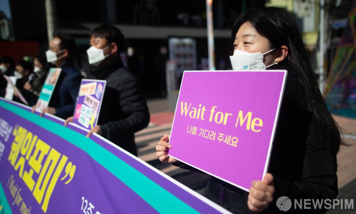 [서울=뉴스핌] 윤창빈 기자 = 한국가족보건협회, 에이랩아카데미가 18일 오후 서울 마포구 홍대 축제거리에서 2021 생명감수성 캠페인 "웨잇포미(wait for me) 기자회견을 열고 피켓을 들고 있다. 이날 기자회견은 엄마 뱃속에서 잘 자라고 있는 만 12주 시기의 태아 형태를 그대로 표현한 실물 크기 모형을 젊음의 상징인 홍대 거리 일대 청년들에게 보여주고 나눠주고 알리면서, 한 생명을 가볍게, 쉽게 생각해서는 안 되겠다는 생명 감수성 운동을 청년층에서 일으키기 위해 열렸다. 2021.02.18 pangbin@newspim.com