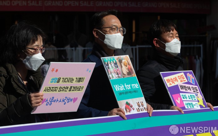 [서울=뉴스핌] 윤창빈 기자 = 한국가족보건협회, 에이랩아카데미가 18일 오후 서울 마포구 홍대 축제거리에서 2021 생명감수성 캠페인 "웨잇포미(wait for me) 기자회견을 개최한 가운데 조해진 국민의힘 의원(가운데)이 피켓을 들고 있다. 이날 기자회견은 엄마 뱃속에서 잘 자라고 있는 만 12주 시기의 태아 형태를 그대로 표현한 실물 크기 모형을 젊음의 상징인 홍대 거리 일대 청년들에게 보여주고 나눠주고 알리면서, 한 생명을 가볍게, 쉽게 생각해서는 안 되겠다는 생명 감수성 운동을 청년층에서 일으키기 위해 열렸다. 2021.02.18 pangbin@newspim.com