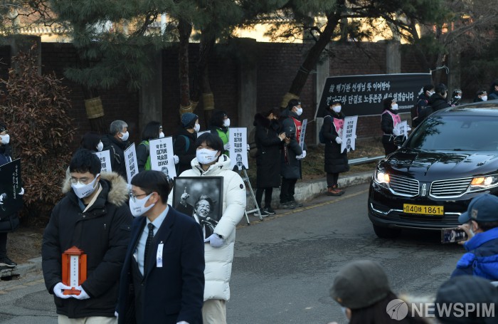 [서울=뉴스핌] 윤창빈 기자 = 19일 오전 서울 종로구 서울대병원 장례식장에서 고(故) 백기완 선생의 발인이 엄수되고 있다. 2021.02.19 pangbin@newspim.com