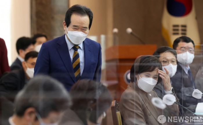 [서울=뉴스핌] 정일구 기자 = 정세균 국무총리가 19일 오후 서울 종로구 정부서울청사에서 열린 제12차 양성평등위원회에 참석하고 있다. 2021.02.19 mironj19@newspim.com