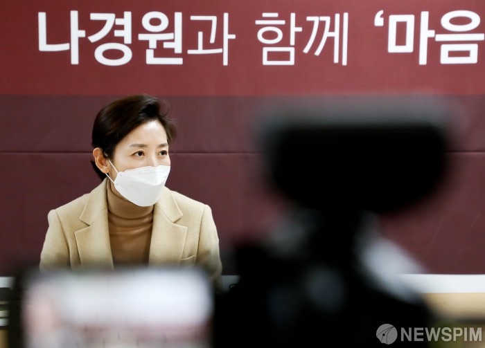 [서울=뉴스핌] 최상수 기자 = 나경원 국민의힘 서울시장 예비후보가 21일 오후 여의도 선거사무실에서 서울시 사회복지단체연합으로 부터 정책건의서를 전달 받은 후 참석자들과 이야기를 나누고 있다. 2021.02.21 kilroy023@newspim.com