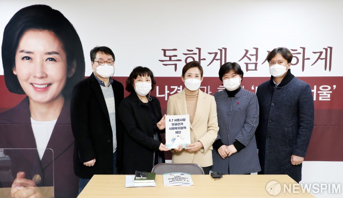 [서울=뉴스핌] 최상수 기자 = 나경원 국민의힘 서울시장 예비후보가 21일 오후 여의도 선거사무실에서 서울시 사회복지단체연합으로 부터 정책건의서를 전달 받고 있다. 2021.02.21 kilroy023@newspim.com