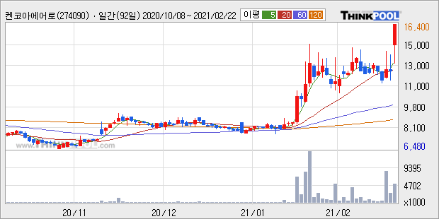 켄코아에어로스페이스는 22일 52주 신고가를 기록하며 상승세를 보이고 있다. 오후 1시 04분 현재 전일 대비 29.64% 오른 1만 6400원에 거래되고 있다. 직전 신고가는 지난 01월 21일 발생한 1만 4800원이었다.