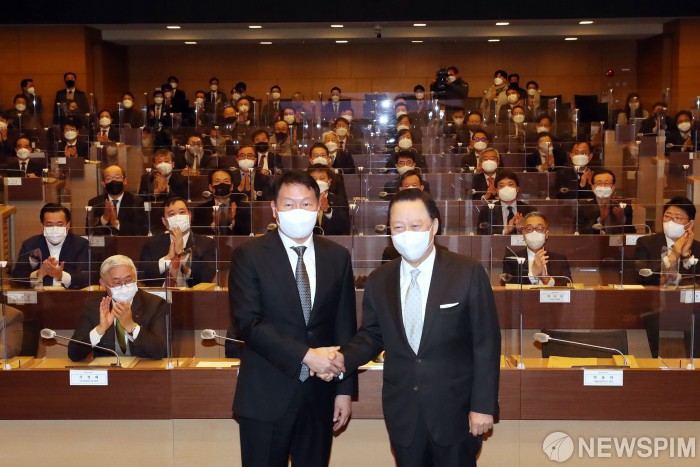 [서울=뉴스핌] 백인혁 기자 = 박용만 대한상공회의소 회장(오른쪽)과 최태원 SK그룹 회장이 23일 오전 서울 중구 대한상공회의소에서 열린 서울상의 정기의원총회에 참석해 악수를 나누고 있다. 2021.02.23 dlsgur9757@newspim.com