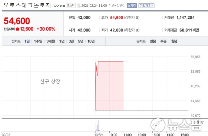 24일 한국거래소에 따르면 오로스테크놀로지 주가는 이날 오전 11시 현재 시초가 대비 30.00% 오른 5만4600원을 기록 중이다. 시초가는 공모가(2만1000원)의 두 배인 4만2000원으로 시작했다.