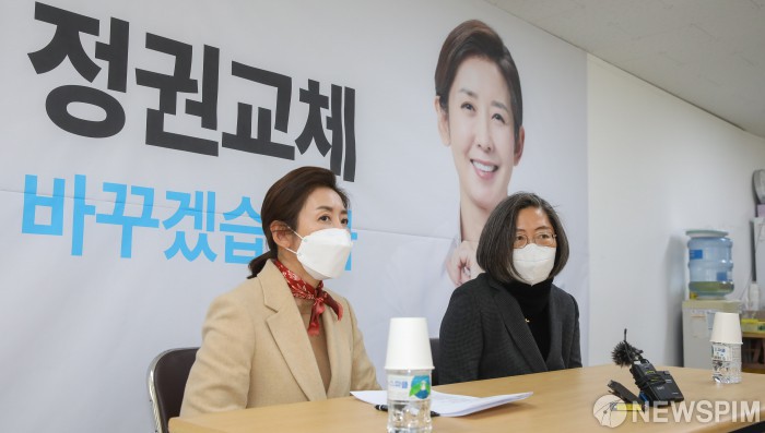 [서울=뉴스핌] 최상수 기자 = 나경원 국민의힘 서울시장 예비후보가 24일 오후 서울 여의도에 마련된 선거사무실에서 이수정 경기대학교 범죄심리학과 교수(오른쪽) 제3호 전문가 고문 영입 기자회견을 갖고 있다. 2021.02.24 kilroy023@newspim.com