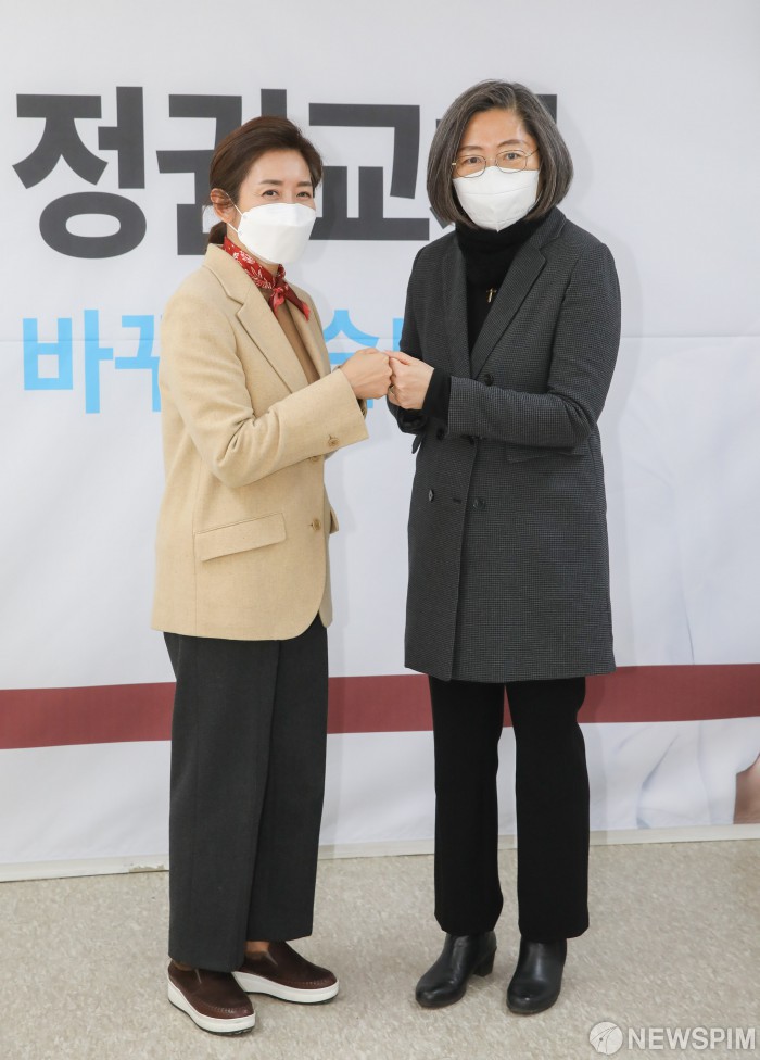 [서울=뉴스핌] 최상수 기자 = 나경원 국민의힘 서울시장 예비후보가 24일 오후 서울 여의도에 마련된 선거사무실에서 이수정 경기대학교 범죄심리학과 교수(오른쪽) 제3호 전문가 고문 영입 기자회견을 마친 뒤 기념촬영을 하고 있다. 2021.02.24 kilroy023@newspim.com