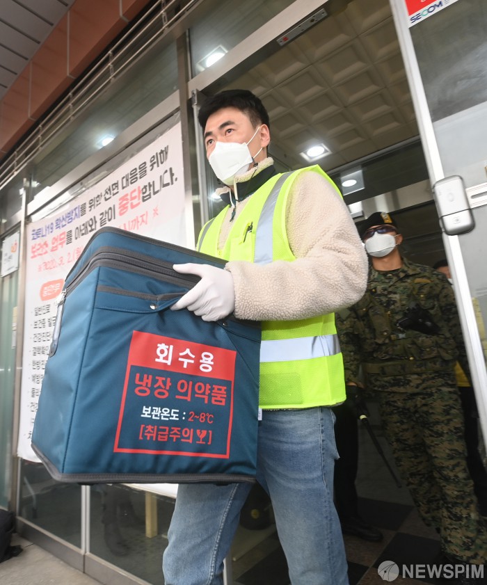 [수원=뉴스핌] 사진공동취재단 = 이천시 지트리비앤티 물류센터에서 출발한 아스트라제네카 백신이 25일 오전 경기도 수원시 권선구보건소에서 도착하여 이송을 마친 뒤 다음 배송지역으로 출발하고 있다. 2021.02.25 photo@newspim.com