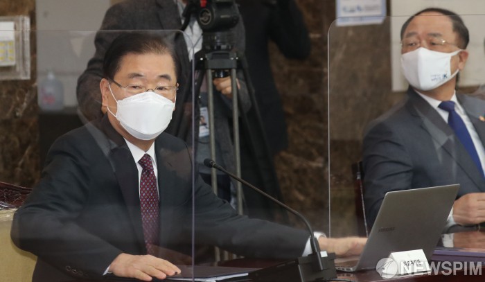[서울=뉴스핌] 백인혁 기자 = 정의용 외교부 장관(왼쪽)과 홍남기 부총리 겸 기획재정부 장관이 26일 오전 서울 종로구 정부서울청사에서 열린 코로나19 백신·치료제 상황점검회의에 참석하고 있다. 2021.02.26 dlsgur9757@newspim.com