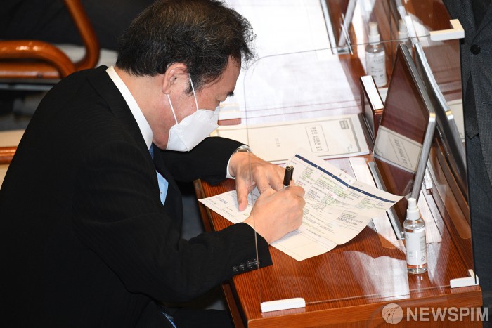[서울=뉴스핌] 최상수 기자 = 이낙연 더불어민주당 대표가 26일 오후 서울 여의도 국회에서 열린 본회의에 참석해 월간 일정표에 메모하고 있다. 2021.02.26 kilroy023@newspim.com