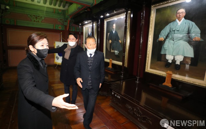 [서울=뉴스핌] 백인혁 기자 = 4·7 재보궐선거에 출마하는 나경원 국민의힘 서울시장 예비후보가 1일 오전 서울 용산구 효창공원 의열사를 찾아 이종래 효창원7위선열기념사업회 회장으로부터 설명을 듣고 있다. 2021.03.01 dlsgur9757@newspim.com