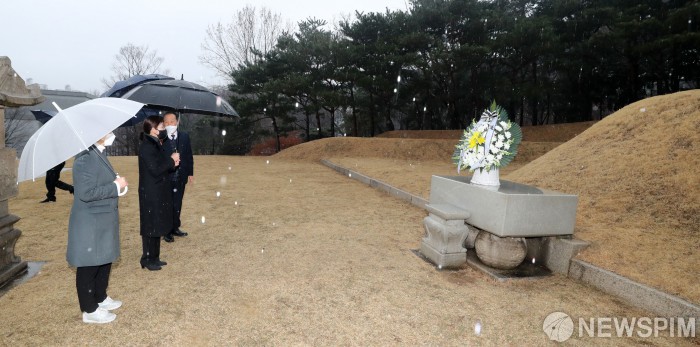 [서울=뉴스핌] 백인혁 기자 = 4·7 재보궐선거에 출마하는 나경원 국민의힘 서울시장 예비후보와 윤봉길 의사의 손녀 윤주경 국민의힘 의원이 1일 오전 서울 용산구 효창공원 백범 김구 묘역을 찾아 참배하고 있다. 2021.03.01 dlsgur9757@newspim.com