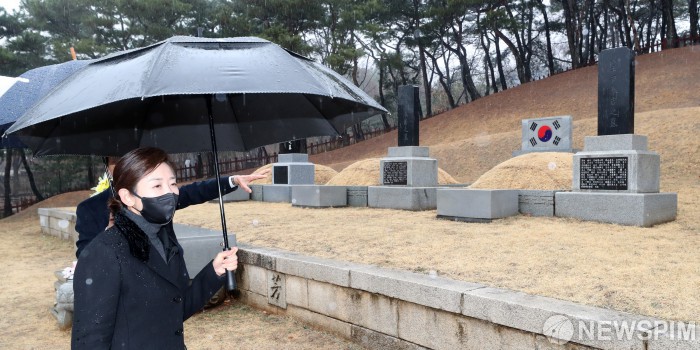 [서울=뉴스핌] 백인혁 기자 = 4·7 재보궐선거에 출마하는 나경원 국민의힘 서울시장 예비후보가 1일 오전 서울 용산구 효창공원 삼의사 묘역을 찾아 참배하고 있다. 2021.03.01 dlsgur9757@newspim.com