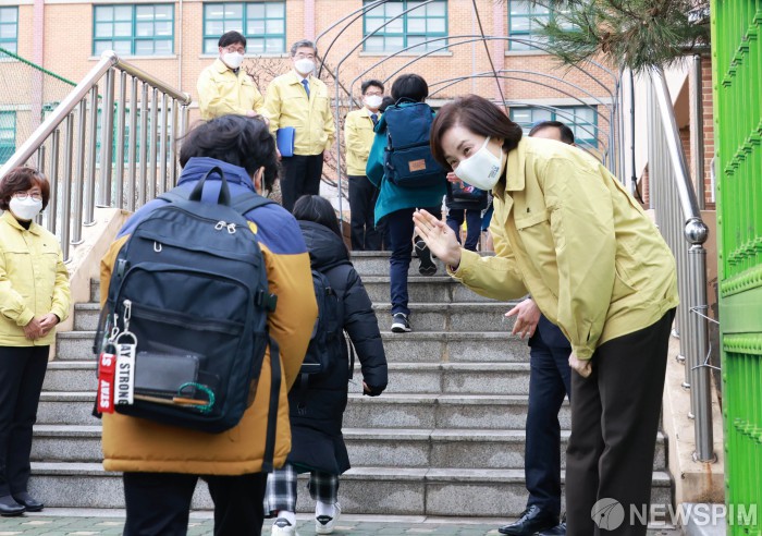[서울=뉴스핌] 유은혜 사회부총리 겸 교육부 장관이 2021학년도 새 학기 개학날인 2일 오전 서울 종로구 청운초등학교를 방문하여 학생들에게 인사하고 있다. [사진=교육부] 2021.03.02 photo@newspim.com