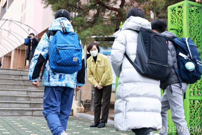 [서울=뉴스핌] 유은혜 사회부총리 겸 교육부 장관이 2021학년도 새 학기 개학날인 2일 오전 서울 종로구 청운초등학교를 방문하여 학생들에게 인사하고 있다. [사진=교육부] 2021.03.02 photo@newspim.com