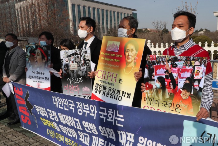 [서울=뉴스핌] 최상수 기자 = 3일 오전 서울 여의도 국회의사당 정문앞에서 더불어민주당 박영순 의원과 미얀마 민주주의 회복을 지지하는 시민단체, 미얀마 군부독재타도 위원회 소모뚜 한국지부장, 미얀마 민족민주연맹(NLD) 얀 나인 툰 한국지부장등이 참석한 가운데 미얀마 민주주의 회복 촉구 기자회견이 열리고 있다. 2021.03.03 kilroy023@newspim.com