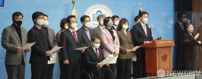 [서울=뉴스핌] 이형석 기자 = 국민의힘 의원들이 3일 오전 서울 여의도 국회 소통관에서 문재인 정권과 여당의 안일한 안보의식을 비판하며 기자회견을 열고 있다. 이날 국민의힘 의원들은 지난 25일 범여권 국회의원 35명이 한·미연합군사훈련 연기를 촉구하는 성명서 발표에 대해 대한민국 국민의 생명과 안전을 최우선으로 삼아야할 정부와 국회의원이라는 존재 자체를 부정하는 것과 다름없다고 주장했다. 2021.03.03 leehs@newspim.com