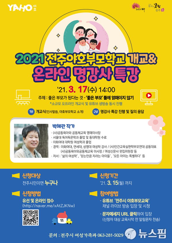 | 2021 전주야호부모학교 개교기념 온라인 명강사 특강 포스터[사진=전주시] 2021.03.03 obliviate12@newspim.com |