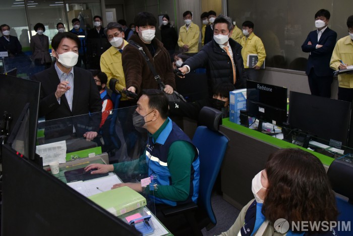[서울=뉴스핌] 국회사진취재단 = 안철수 국민의당 대표가 3일 오전 서울 성동구 고산자로 성동구청 내 스마트도시통합운영센터를 방문해 구청관계자와 대화를 하고 있다. 2021.03.03 photo@newspim.com