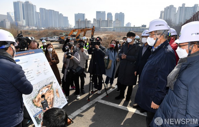 [서울=뉴스핌] 국회사진취재단 = 김종인 국민의힘 비상대책위원장이 3일 서울 용산 정비창 부지 정화사업 현장을 방문해 관계자로부터 사업내용을 듣고 있다. 2021.03.03 photo@newspim.com