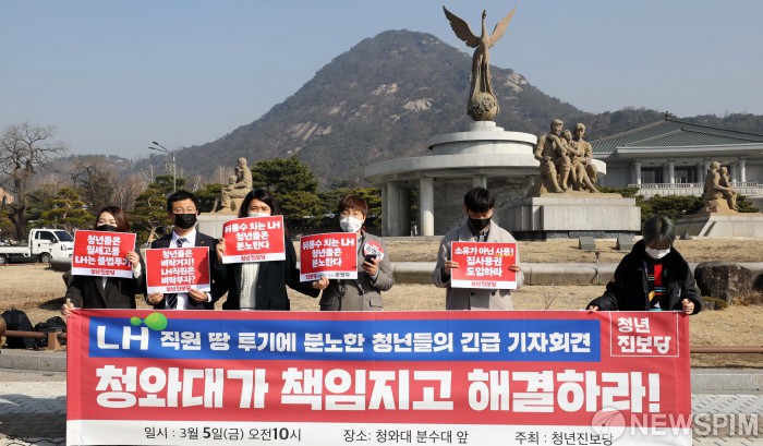 [서울=뉴스핌] 백인혁 기자 = 청년진보당 관계자들이 5일 오전 서울 종로구 청와대 분수대 앞에서 LH직원 땅 투기 의혹에 대한 청와대 해결 촉구 기자회견을 하고 있다. 2021.03.05 dlsgur9757@newspim.com
