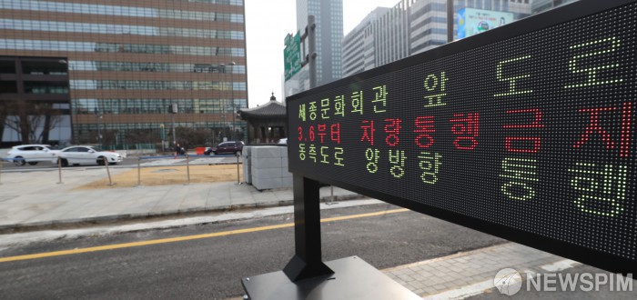 [서울=뉴스핌] 김학선 기자 = 6일 0시부터 광화문광장 동측도로(주한 미국대사관 앞)가 기존 일방통행에서 양방향 통행으로 바뀌고 서측도로(세종문화회관 앞)는 폐쇄됐다. 서측도로 공간은 기존의 광화문광장과 연결되면서 시민이 일상에서 즐기는 걷기 편한 광장으로 변신한다. 이날 오전 서울 광화문 서측도로 통행이 통제되고 있다. 2021.03.06 yooksa@newspim.com