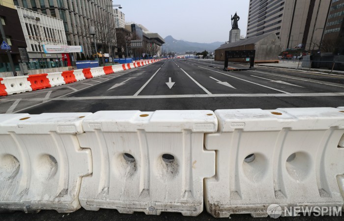 [서울=뉴스핌] 김학선 기자 = 6일 0시부터 광화문광장 동측도로(주한 미국대사관 앞)가 기존 일방통행에서 양방향 통행으로 바뀌고 서측도로(세종문화회관 앞)는 폐쇄됐다. 서측도로 공간은 기존의 광화문광장과 연결되면서 시민이 일상에서 즐기는 걷기 편한 광장으로 변신한다. 이날 오전 서울 광화문 서측도로 통행이 통제되고 있다. 2021.03.06 yooksa@newspim.com