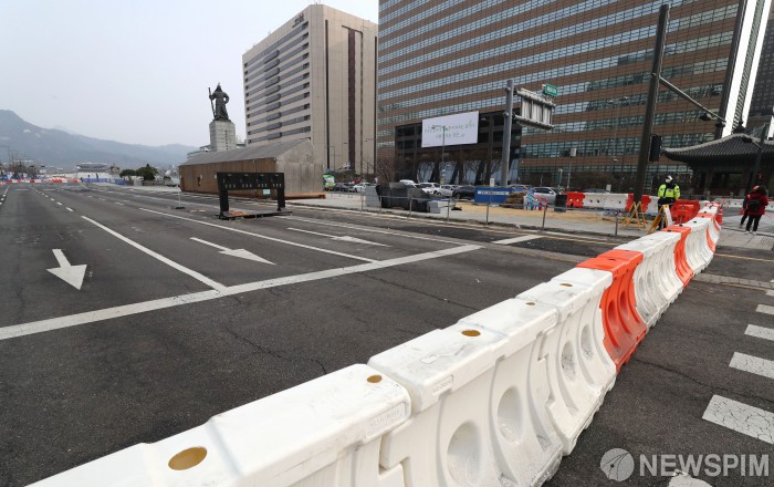 [서울=뉴스핌] 김학선 기자 = 6일 0시부터 광화문광장 동측도로(주한 미국대사관 앞)가 기존 일방통행에서 양방향 통행으로 바뀌고 서측도로(세종문화회관 앞)는 폐쇄됐다. 서측도로 공간은 기존의 광화문광장과 연결되면서 시민이 일상에서 즐기는 걷기 편한 광장으로 변신한다. 이날 오전 서울 광화문 서측도로 통행이 통제되고 있다. 2021.03.06 yooksa@newspim.com