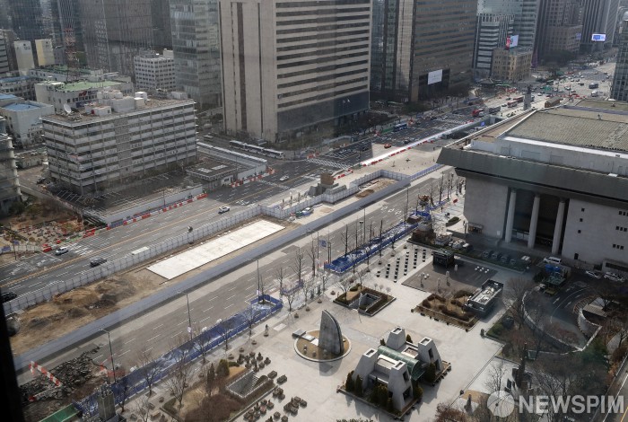 [서울=뉴스핌] 이형석 기자 = 광화문광장 재구조화 공사로 세종문화회관 쪽 서측차로를 폐쇄하고 동측차로(주한미국대사관 앞) 양방향 통행 둘째 날인 7일 휴일의 영향으로 원활한 교통 흐름을 보이고 있다. 서울시는 지난 6일 0시부터 광화문광장 서측차로(세종문화회관 앞)를 폐쇄하고 동측차로는 기존 편도 5차로에서 양방향 7~9차로(주행차로는 7차로)로 확장했다. 2021.03.07 leehs@newspim.com