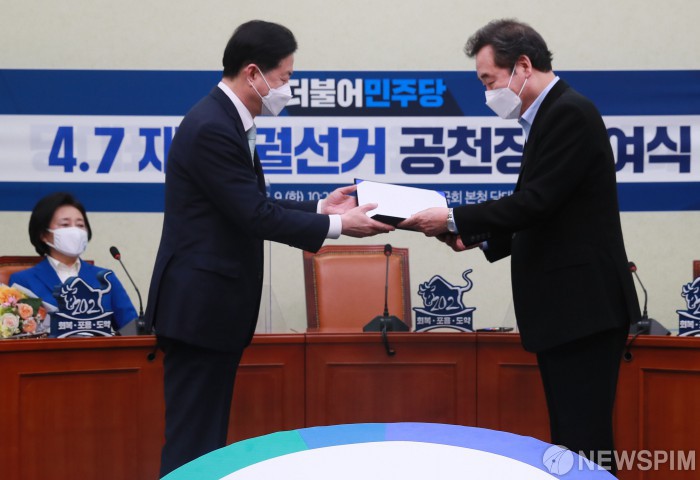 [서울=뉴스핌] 이형석 기자 = 이낙연 더불어민주당 대표가 9일 오전 서울 여의도 국회에서 김영춘 부산시장 후보에게 공천장을 수여하고 있다. 2021.03.09 leehs@newspim.com