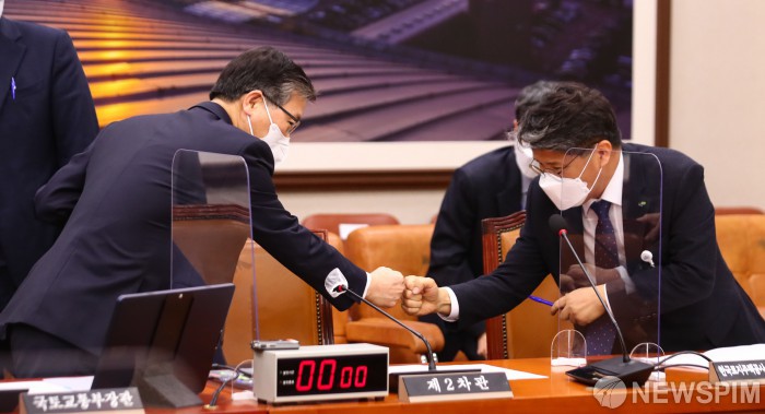 [서울=뉴스핌] 최상수 기자 = 9일 국회에서 열린 국토교통위원회 전체회의에서 변창흠 국토교통부 장관(왼쪽)과 장충모 한국토지주택공사 사장 직무대행(오른쪽)이 인사하고 있다. 2021.03.09 kilroy023@newspim.com
