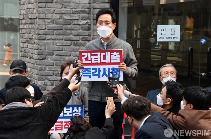 [서울=뉴스핌] 국회사진취재단 = 국민의힘 오세훈 서울시장 후보가 10일 서울 명동을 방문해 상가 관계자들과 간담회를 갖고 모두발언을 하고 있다. 2021.03.10 photo@newspim.com
